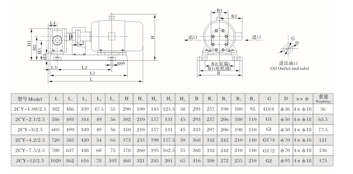 2CY系列齿轮式润滑泵进、出油口为与口径对应的英制管螺纹(G),直接制作在泵体上。KCB18.3-200、2CY1.1-12齿轮式输油泵配带管螺?口的腰形法兰;其余泵不配带法兰,当用户需要配带法兰时,应在订货中注明。
